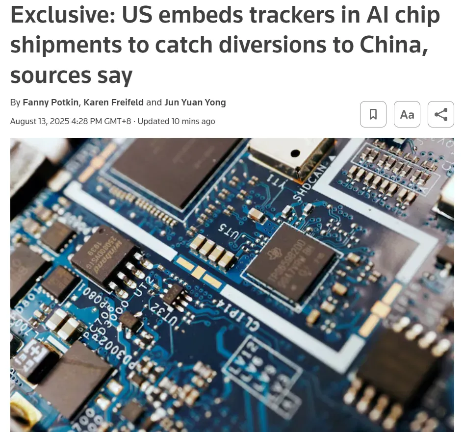8月13日,路透社又刊发独家报导爆料,美国隐秘在人工智能相关芯片中设置追寻器,以发现“芯片被转运至我国的状况”。